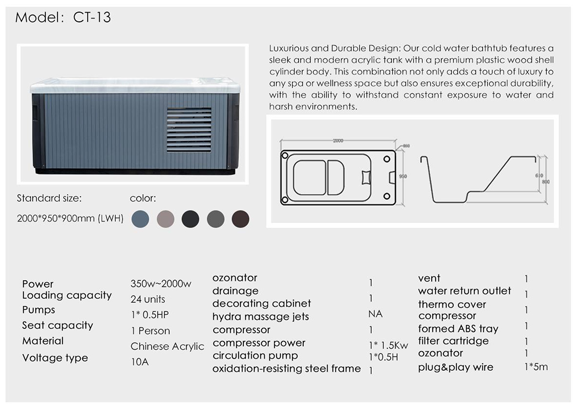 We offer a variety of cold water bathtubs in different sizes and shapes to meet your specific needs. You can also choose from various colors and finishes.