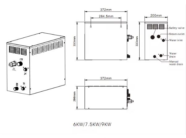 GS08M series is available in 4.5kW,6kw,7.5kw, 9kw,10.5kW,12kW,15kW,18kW,the users could choose different KW according to their steam room size. GS08M steam generator comes with GS08M control panel. Multi steam generators can be work together with one control panel, or 2pcs control panels can be work together with one steam generator.